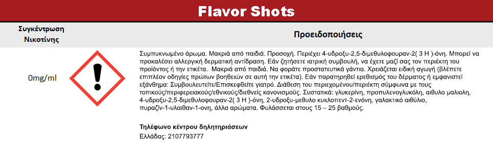 Προσοχή. Περιέχει 4-υδροξυ-2,5-διμεθυλοφουραν-2( 3 Η )-όνη. Μπορεί να προκαλέσει αλλεργική δερματική αντίδραση. Εάν ζητήσετε ιατρική συμβουλή, να έχετε μαζί σας τον περιέκτη του προϊόντος ή την ετικέτα. Μακριά από παιδιά. Να φοράτε προστατευτικά γάντια. Χρειάζεται ειδική αγωγή (βλέπετε επιπλέον οδηγίες πρώτων βοηθειών σε αυτή την ετικέτα). Εάν παρατηρηθεί ερεθισμός του δέρματος ή εμφανιστεί εξάνθημα: Συμβουλευτείτε/Επισκεφθείτε γιατρό. Διάθεση του περιεχομένου/περιέκτη σύμφωνα με τους τοπικούς/περιφερειακούς/εθνικούς/διεθνείς κανονισμούς. Συστατικά: γλυκερίνη, προπυλενογλυκόλη, αιθυλο μαλιολη, 4-υδροξυ-2,5-διμεθυλοφουραν-2( 3 Η )-όνη, 2-υδροξυ-μεθυλο κυκλοπεντ-2-ενόνη, γαλακτικό αιθύλιο, πυραζίν-1-υλαιθαν-1-ονη, άλλα αρώματα. Φυλάσσεται στους 15 – 25 βαθμούς.