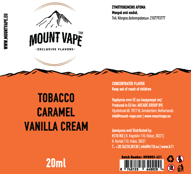 MOUNT VAPE TOBACCO CARAMEL VANILLA CREAM 20ML/30ML FLAVORSHOT, ένα γλυκό καπνικό άρωμα που αποτελεί μία από τις καλύτερες προτάσεις μας.