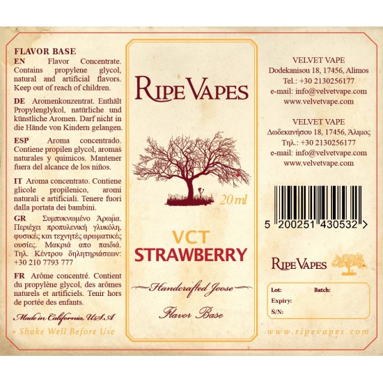 Το Ripe Vapes VCT Strawberry 20ml to 60ml Flavor χρειάζεται 48 ώρες για να ωριμάσει. Για ακόμη καλύτερα αποτελέσματα μπορείτε να το αφήσετε να ωριμάσει για 15 με 20 ημέρες. Το προϊόν είναι αραιωμένο με βάση PG.