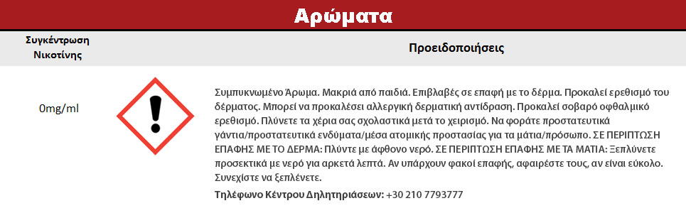 Συστατικά: Συμπυκνωμένο μείγμα αρωμάτων, διαλυμένο σε προπυλενική γλυκόλη (FEMA 2940). Δεν περιέχει ζάχαρη και γλουτένη.