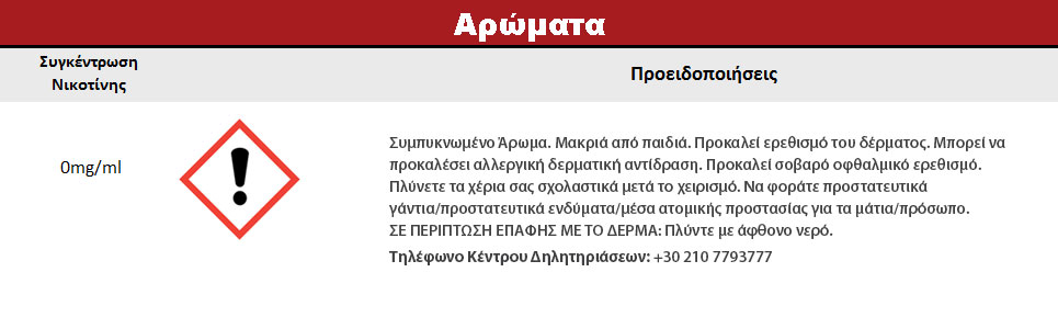 Συστατικά: Συμπυκνωμένο μείγμα αρωμάτων, διαλυμένο σε προπυλενική γλυκόλη (FEMA 2940). Δεν περιέχει ζάχαρη και γλουτένη.
