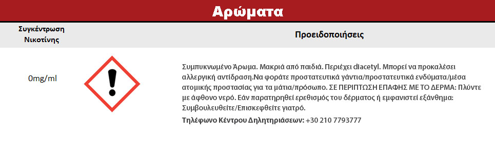 Συστατικά: Συμπυκνωμένο μείγμα αρωμάτων, διαλυμένο σε προπυλενική γλυκόλη (FEMA 2940). Δεν περιέχει ζάχαρη και γλουτένη.