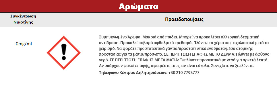 Συστατικά: Συμπυκνωμένο μείγμα αρωμάτων, διαλυμένο σε προπυλενική γλυκόλη (FEMA 2940). Δεν περιέχει ζάχαρη και γλουτένη.