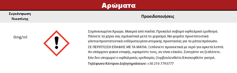 Συστατικά: Συμπυκνωμένο μείγμα αρωμάτων, διαλυμένο σε προπυλενική γλυκόλη (FEMA 2940). Δεν περιέχει ζάχαρη και γλουτένη.