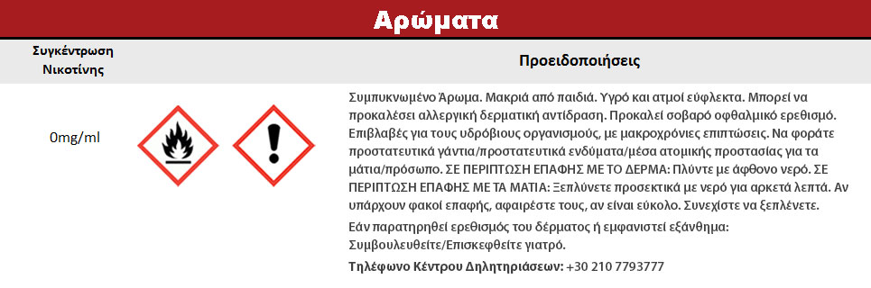 Συστατικά: Συμπυκνωμένο μείγμα αρωμάτων, διαλυμένο σε προπυλενική γλυκόλη (FEMA 2940). Δεν περιέχει ζάχαρη και γλουτένη.