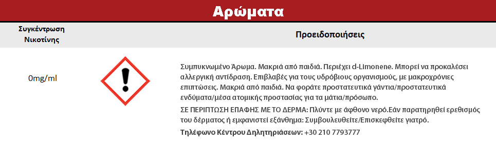 Περιέχει d-Limonene. Μπορεί να προκαλέσει αλλεργική αντίδραση. Επιβλαβές για τους υδρόβιους οργανισμούς, με μακροχρόνιες επιπτώσεις. Μακριά από παιδιά. Να φοράτε προστατευτικά γάντια/προστατευτικά ενδύματα/μέσα ατομικής προστασίας για τα μάτια/πρόσωπο. ΣΕ ΠΕΡΙΠΤΩΣΗ ΕΠΑΦΗΣ ΜΕ ΤΟ ΔΕΡΜΑ: Πλύντε με άφθονο νερό.Εάν παρατηρηθεί ερεθισμός του δέρματος ή εμφανιστεί εξάνθημα: Συμβουλευθείτε/Επισκεφθείτε γιατρό.