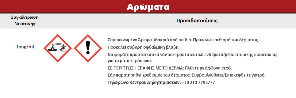 Συστατικά: Συμπυκνωμένο μείγμα αρωμάτων, διαλυμένο σε προπυλενική γλυκόλη (FEMA 2940). Δεν περιέχει ζάχαρη και γλουτένη.