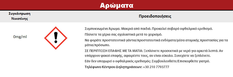 Συστατικά: Συμπυκνωμένο μείγμα αρωμάτων, διαλυμένο σε προπυλενική γλυκόλη (FEMA 2940). Δεν περιέχει ζάχαρη και γλουτένη.