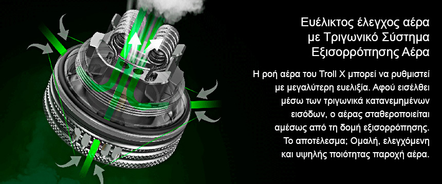 Ο Troll X RTA θα σας εντυπωσιάσει από την πρώτη εισπνοή με την θεαματική του απόδοση. Το λέει και το όνομα του άλλωστε, καθώς το “X” υποδηλώνει ότι η γεύση που αποδίδει είναι 10 φορές καλύτερη από την προηγούμενη έκδοση. Διαθέτει πολλές επιλογές αέρα για να προσαρμόσετε την τζούρα στο επιθυμητό επίπεδο.