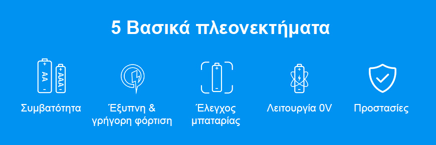 • Μοναδική τεχνολογία CVSA για μπαταρίες NiMH, υψηλότερη ακρίβεια ανίχνευσης πλήρους φόρτισης, ταχύτερη και ασφαλέστερη φόρτιση.